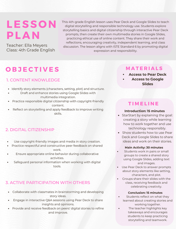 In this lesson plan, I integrated ISTE Standard 6 by encouraging students to use digital tools like Pear Deck and Google Slides for storytelling while promoting responsible digital citizenship. By creating stories with multimedia elements, students learned to work together, share ideas, and give constructive feedback. They also practiced using online content ethically and responsibly, ensuring their work was copyright-friendly. The lesson helped me develop my teaching skills in managing digital collaboration and fostering a creative environment. This assignment in my portfolio highlights my growth in using technology to support active learning, collaboration, and responsible use of digital tools.